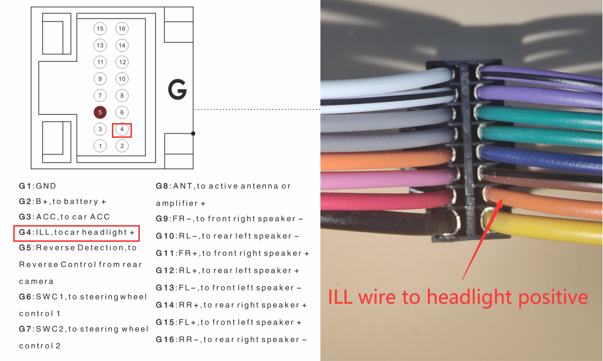 2) Leave the ILL detection on, and connect the G4 (ILL orange wire) to car’s headlight positive. In this way the button light will turn on and the screen will dim when you turn on your car’s headlight.